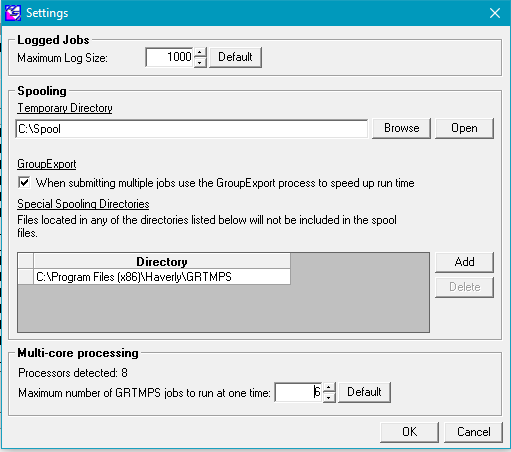 Special Spooling Directories is a list of locations with files that should not be included in the zip.  When a job runs, it will use the file from its normal location.  I have exempted my GRTMPS system folder, as anything from there, primarily the GRTMPS PGB, is used read-only.   There is no need to copy this rather large file multiple times.