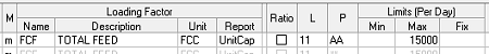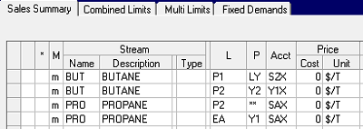 Process Limits stand out for being shorter than most other rows, and ending with P(M), where M is G, L or E – greater than (MIN), less than (MAX), or equal to (FIX) – and indicates the direction of the constraint.   So R1AACDU_]PL is the maximum on limit CDU at R1 during period AA.  Process limits are also usually 3 characters when entered and padded with "_]".    Crude specific limits also exist, often as part of depooling controls, and have the crude code instead of padding.  R1AAcpc00PE is the fixed constraint on ?00, for crude cpc.