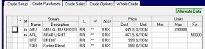 | The Alternate functionality, however, is just what you need when the point of the case is a change in group membership, specifications or blend logic. Exer8a in the Wt Demo model is about looking at using Naphtha as a diluent in heavier fuel oils. The Blend logic modifications for that are shown in yellow like this. This is the only panel where modification is tracked by individual cell, rather than the whole row. |