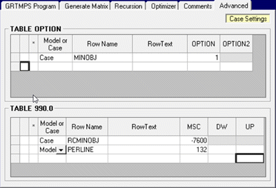 If you added a minimum to the objective function, would it make the model solve to the better answer? The idea is very appealing and there was a fad in the late 90’s for adding a replica of the objective function row, constrained to a something nearer the better value.   This feature is still available in GRTMPS.   It can be activated on the Advanced settings on the Case Node.